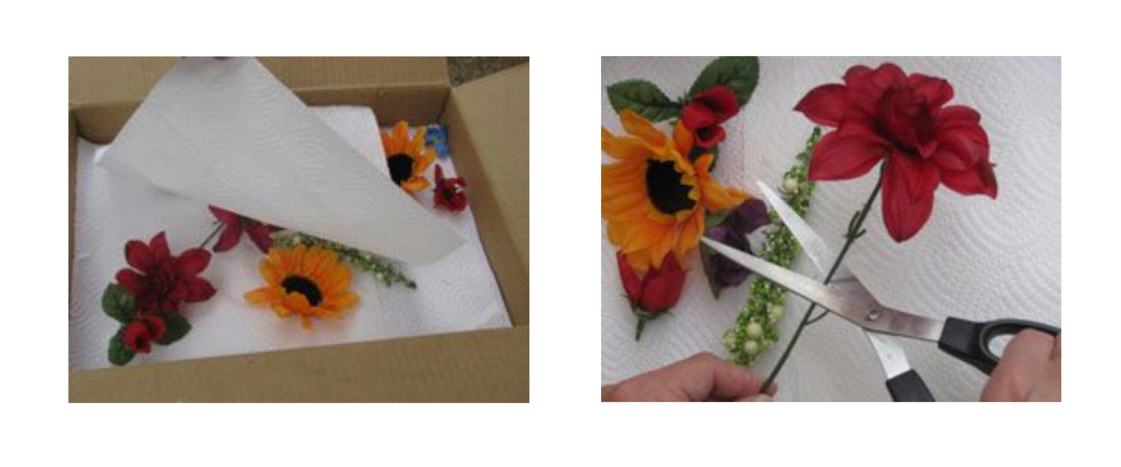3) Pad any extra space in the box with crumpled paper towels, or other paper so flowers do not shift.